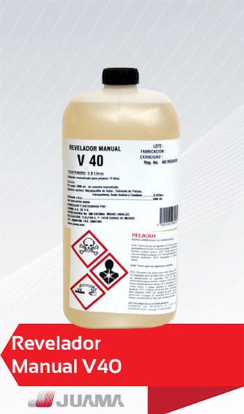| Revelador Manual V40 para preparar 19 Litros. | Revelador concentrado para proceso manual para preparar 19 litros de solución. En presentación de: Envase de 3.8 litros.