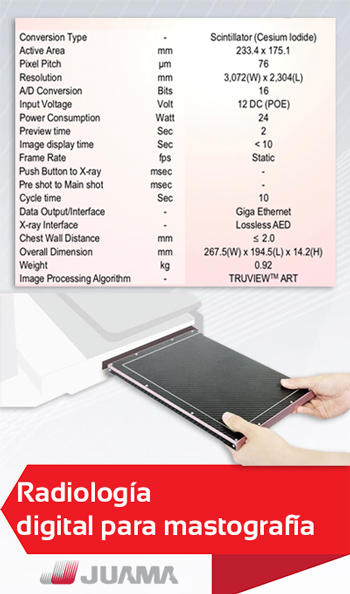 | Radiología digital para mastografía | Flat Panel Detector para mastografía. Sistema alámbrico, calidad digital y flujo rápido en su sistema de mastografía. Medidas: : 8x10 / 10x 12.
