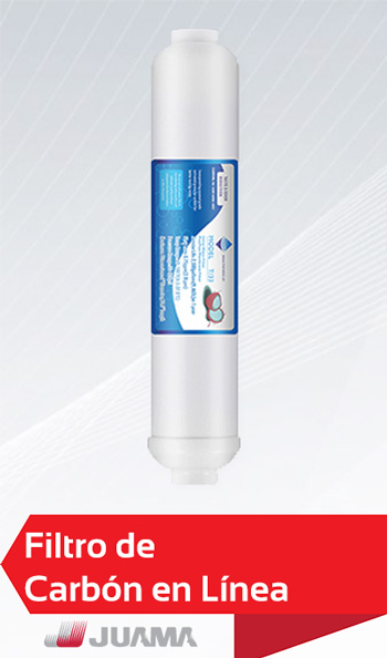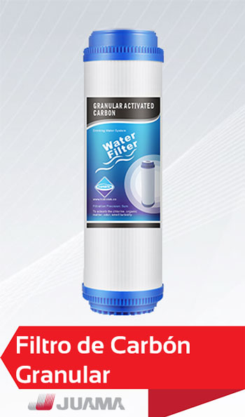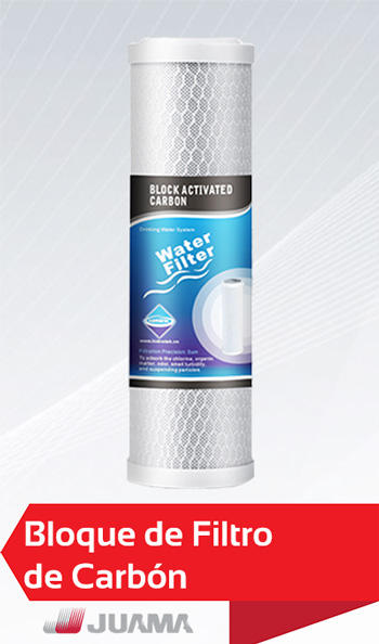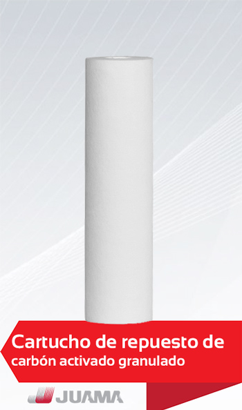 | Cartucho de repuesto de carbón activado granulado | Este es sumamente eficiente al remover el mal olor, cloro y sabor del agua, así como sólidos pesados (plomo, mercurio) en el agua. Su diseño es en bloque y el pulido del agua es más fino para mayor retención.