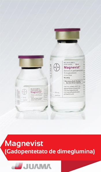 | Magnevist (Gadopentetato de dimeglumina) | Medio de contraste marca Bayer indicado para uso en resonancia magnética en pacientes adultos y pediátricos (a partir de 2 años de edad), para visualizar lesiones con vascularidad anormal en el cerebro (lesiones intracraneales), columna, corazón, tejido blando de articulaciones y el interior de los huesos.