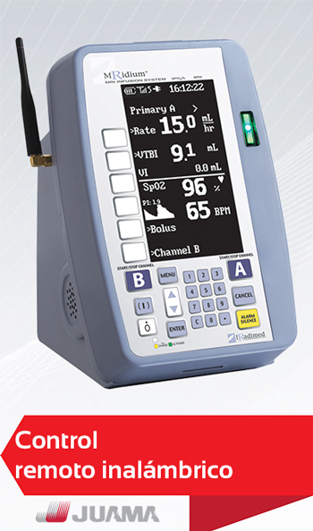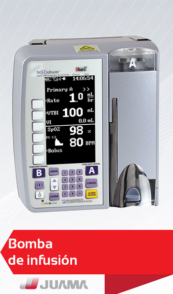| Bomba de infusión compatible con RM | EL sistema de Infusión 3860 permite la administración continua de medicamento y fluidos durante todo el ciclo de atención en la resonancia magnética. El diseño no magnético del sistema MRIdium permite su operación en altos campos magnéticos. Modelo MRIdium 3860.